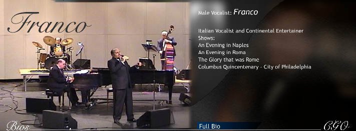 Franco is best known for his renditions of classic Italian/American songs made famous by celebrities like Dean Martin, Al Martino, Connie Francis and Jerry Vale, but he also performs the continental music of international superstars like Julio Iglesias, Andrea Bocelli and Frank Sinatra.